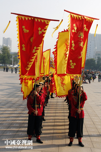 大祭幡隊伍在神農城廣場整裝待發。(中國臺灣網 陳睿 攝)