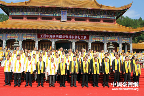 參加祭祀活動(dòng)的兩岸嘉賓代表于神農(nóng)大殿前合影。(中國臺(tái)灣網(wǎng) 陳睿 攝)
