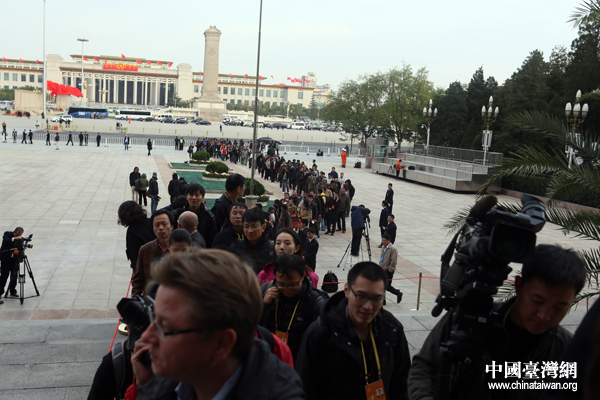 8日上午9時,中國共產黨第十八次全國代表大會將在京開幕。而來自國內外的媒體記者,也構成了人民大會堂前一道靚麗的風景。圖為7日下午,記者們排隊進入人民大會堂采訪十八大首場新聞發布會。(中國臺灣網 王偉 攝)