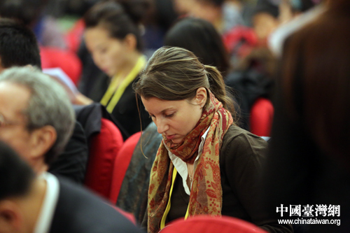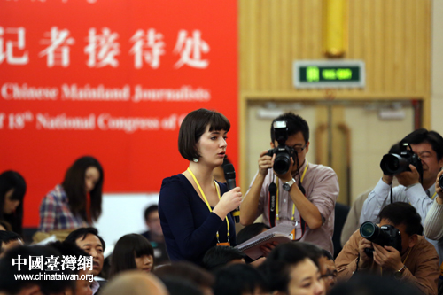 11月11日下午,十八大新聞中心在梅地亞中心二樓多功能廳舉辦中外記者招待會(huì),介紹文化體制改革和公共文化服務(wù)體系建設(shè)情況,并回答記者提問。圖為澳大利亞女記者提問。(中國(guó)臺(tái)灣網(wǎng) 王偉 攝)