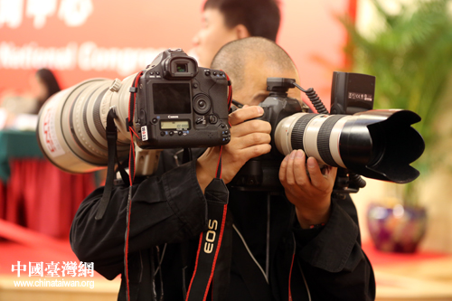 11月11日下午,十八大新聞中心在梅地亞中心二樓多功能廳舉辦中外記者招待會,介紹文化體制改革和公共文化服務體系建設情況,并回答記者提問。圖為身背兩套設備的攝影記者。(中國臺灣網 王偉 攝)