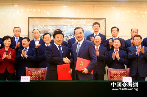 中國臺灣網11月12日北京消息  今天下午,國務院臺灣事務辦公室與貴州省人民政府在京正式簽署促進黔臺交流合作備忘錄。中共中央臺辦、國務院臺辦主任王毅,貴州省委書記、省長趙克志等領導出席了簽字儀式。(中國臺灣網記者 馬迪)