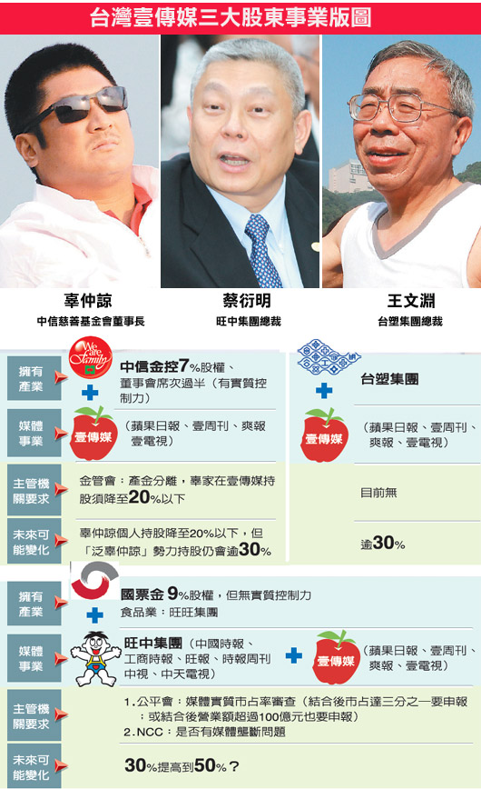 臺當局“金管會”要求辜仲諒,投資壹傳媒,持股必須低于20%、完全不能涉入壹傳媒的經營、也不能擔任買家代表人與壹傳媒大股東黎智英簽約。