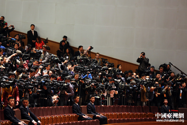 11月14日,中國共產黨第十八次全國代表大會閉幕會在北京人民大會堂舉行。 圖為記者在采訪拍攝。(中國臺灣網 王偉 攝)