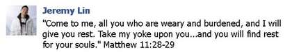 林書豪賽后在臉書(facebook)上傳馬太福音部分內容。圖片來自網絡
