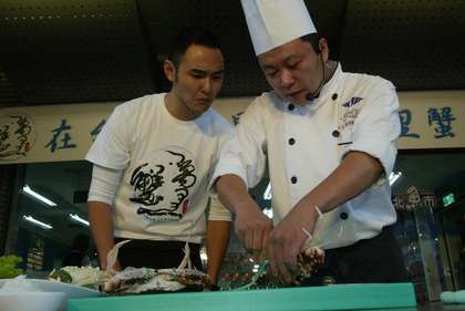 廚師在旁指導阮經天如何烹調萬里蟹。圖片來自臺媒