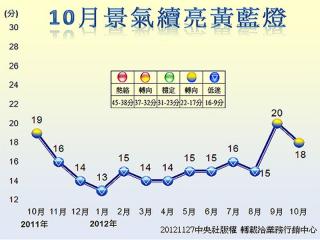 臺當局“經建會”27日公布10月景氣燈號,連續第2個月亮出黃藍燈。圖片來源:臺灣“中央社”