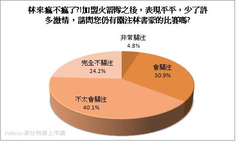 調(diào)查結(jié)果顯示,非常關(guān)注4.8%和會關(guān)注30.9%,兩者合計35.7%,雖不在少數(shù),但還是低于不太會關(guān)注40.1%和完全不關(guān)注24.2%合計的64.3%。相較在2012年初林書豪表現(xiàn)高檔時,電視媒體每天放送最新消息,甚至還有專題報道,而現(xiàn)在只有在有比賽時顯示比分?jǐn)?shù)和最新戰(zhàn)況。相較于年初做的調(diào)查,當(dāng)時有近半數(shù)(46.5%)的民眾會因為林書豪而增加對NBA的關(guān)注,民眾對林書豪的熱度似乎也略微下滑。