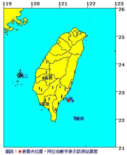 臺東縣綠島和屏東縣三地門震感最明顯,震度皆為2級。臺東市、屏東市、臺南市新化、嘉義市、高雄市、彰化市和斗六市震度則為1級。(中國臺灣網(wǎng) 李帥)