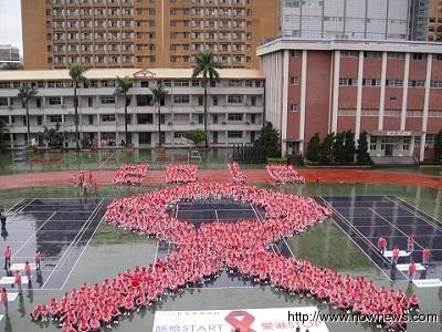 宣導青少年艾滋病預防,臺北市開南高級商工職業學校1706位學生30日冒雨排出象征關懷艾滋病的紅絲帶。(圖片來自臺灣“今日新聞網”)