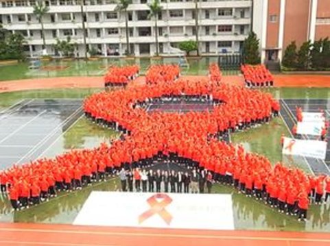 臺灣1000多名學生排出巨型紅絲帶圖樣,呼吁年輕學子,應避免不安全性行為,保護自己遠離愛滋。圖片來自臺灣今日新聞網