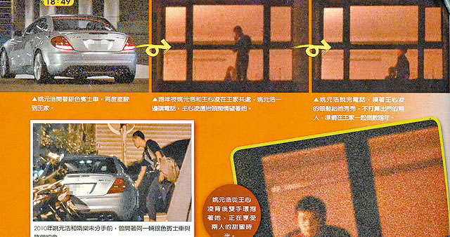 去年10月姚元浩稱與王心凌幾乎沒有聯(lián)絡(luò),王心凌在圣誕節(jié)前夕為演唱會定裝時也稱與姚元浩已沒聯(lián)絡(luò)。但昨出刊的《壹周刊》卻爆料去年12月14日拍到姚元浩自由進(jìn)出王家,跨年當(dāng)天更拍到他將銀色奔馳直接開進(jìn)可看臺北101煙火的王家,與友人在王家開趴,2人還趁著等煙火空檔,走到窗邊看夜景,姚從后面環(huán)抱她、她則把頭靠在他的胸膛。
