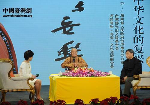 星云大師與海南省文化名人韓少功對話“幸福生活與中華文化復興”。(中國臺灣網 馬萌攝)