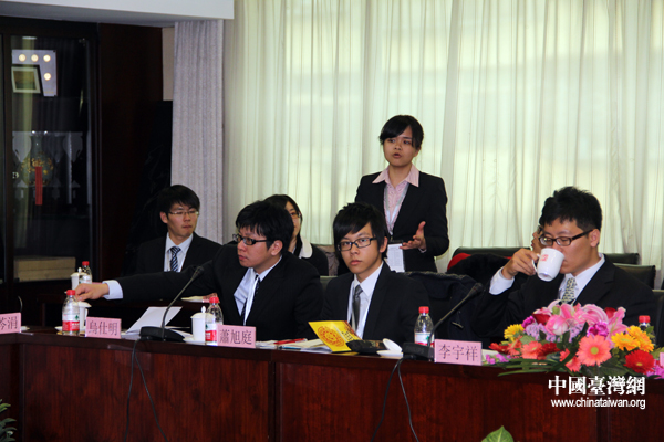 民革青年黨員代表趙龍與“杰青團”同學互相交流意見。(中國臺灣網(wǎng) 芮益芳 攝)