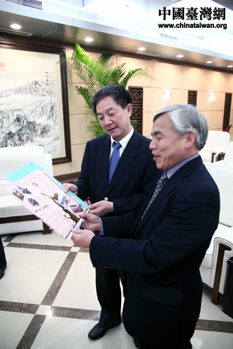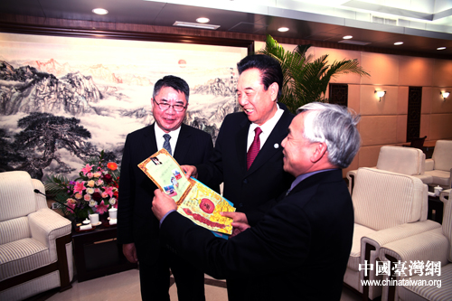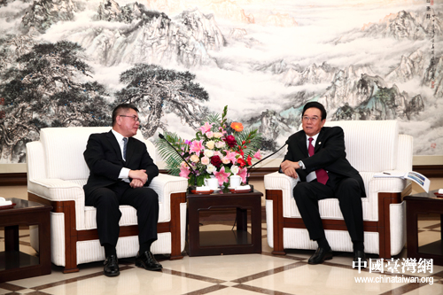 21日下午,海峽兩岸關(guān)系協(xié)會(huì)會(huì)長(zhǎng)陳云林(右)在北京會(huì)見了來京交流的廣東東莞臺(tái)商子弟學(xué)校董事長(zhǎng)葉宏燈(左),及其率領(lǐng)的該校校董、師生與家長(zhǎng)代表。(中國(guó)臺(tái)灣網(wǎng) 于斯文 攝)
