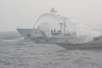 中國臺灣網(wǎng)1月24日消息 據(jù)臺灣媒體報道,今天凌晨1時46分,臺灣保釣人士帶著一尊大甲媽祖神像,搭乘“全家福”號漁船從新北市深澳漁港出發(fā),10時32分進逼釣魚島28海里處時,遭日艦噴水柱,甚至排放黑煙、造浪等方式驅(qū)趕,臺灣艦艇上前阻擋,也以水柱反擊。