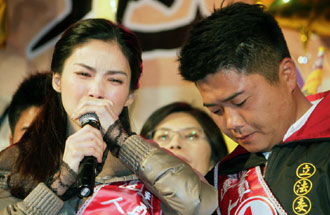 顏寬恒妻子陳麗凌(左)用淚水真情催票。(圖片來源:臺灣“聯(lián)合新聞網(wǎng)”)