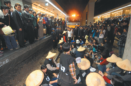據臺灣《聯合報》報道,昨晚7時40分,近200名勞工“攻占”臺北火車站第3月臺后,數十位年長勞工于8時許火車進站時集體跳下月臺臥軌。晚間近9時,臺北鐵路警察驅離軌道上的抗議者,列車逐漸恢復通行。不過,臺北站第3月臺上的抗議者直到晚間10時58分才被清場。據臺鐵估計,昨晚因勞工抗議活動,共有40列次火車晚點,延誤超過10600名旅客。