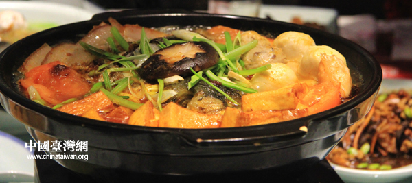 火鍋永遠(yuǎn)是用來壓軸的。沙茶是閩南臺灣一代民眾喜愛的口味。熱氣騰騰的火鍋中,用臺灣秘制沙茶醬烹煮臘肉、魚丸、貢丸、香菇,再加上北京密云水庫的水庫魚。最大程度還原了原汁原味的“臺菜”味道。 (圖文/李徽)