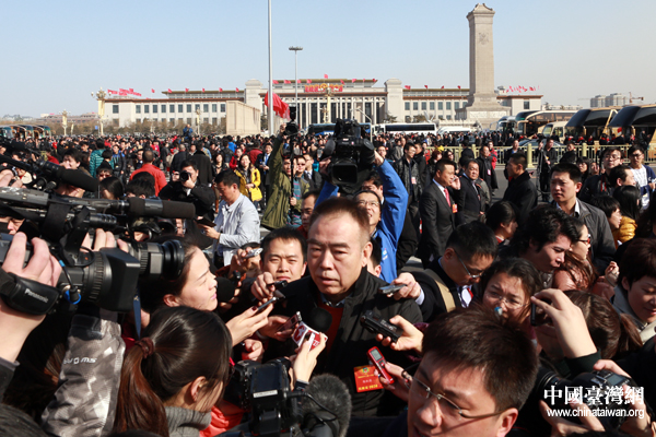 開(kāi)幕會(huì)舉行前,政協(xié)委員張國(guó)立在人民大會(huì)堂前遭遇各路記者圍追堵截。(中國(guó)臺(tái)灣網(wǎng) 于斯文 攝)