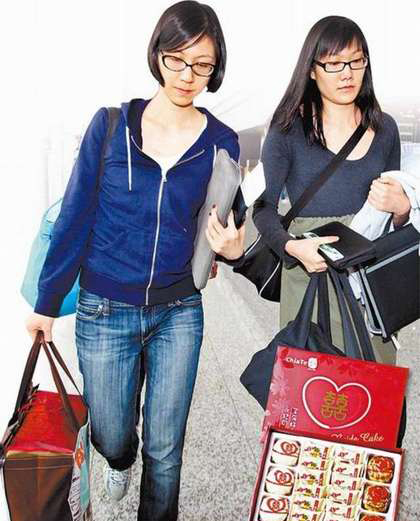 馬唯中(左)昨搭機(jī)赴港,妹妹馬元中陪在旁。馬唯中很可能送“佳德糕餅”給友人。圖片來自臺(tái)灣媒體