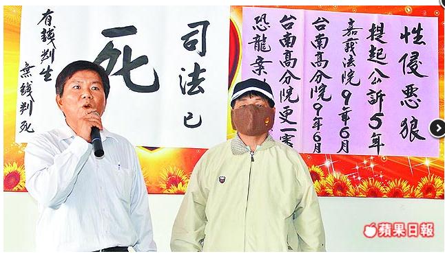 邱男更一審獲改判無(wú)罪,女會(huì)計(jì)的父親(右)出面為女兒喊冤。(圖片來(lái)自臺(tái)灣《蘋果日?qǐng)?bào)》)
