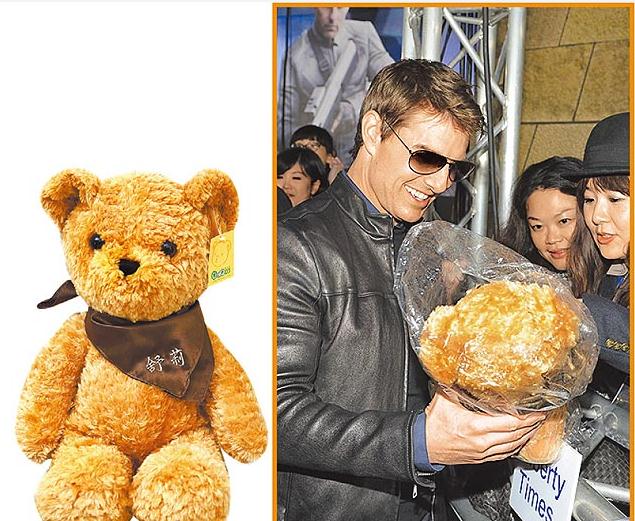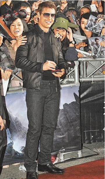 他前晚抵臺,有500多名粉絲在晶華飯店守候,昨晚的首映會吸引了2千多人,引爆他3天2夜寶島行的高潮。昨天臺北春雨綿綿,熱情粉絲下午2點多就到大直卡位,晚間6點43分阿湯哥穿皮衣勁裝現身,正好天公作美雨停,現場尖叫聲四起。阿湯哥在紅毯上來回穿梭,幫左右兩邊的影迷簽名、合照,150公尺的紅毯走了2個多小時。他收到繡有女兒舒莉中文名字的小熊,開心表示:“太棒了,她會很開心。”