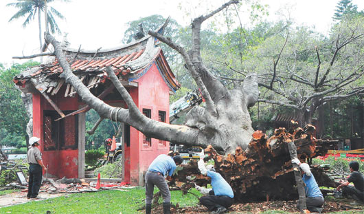 臺南市孔廟一棵六十年老樹傾倒,壓壞孔廟東側“禮門”,古跡修復工站在禮門前,感到相當不舍,一旁則是急著搶救老樹的樹醫生。圖片來自臺灣《聯合報》
