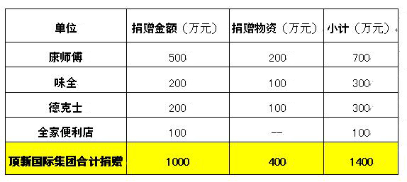 頂新集團董事長表示,頂新國際集團作為扎根大陸的臺資企業,在24年發展的過程中得到了全社會及全國人民的支持,所有的事業體更始終遵循“取之于民,用之于民,回饋社會,永續經營”的經營之道,有責任有義務為貢獻自己的一份綿薄之力,希望雅安人民早日走出困境,重新回到生活建設的軌道上來。