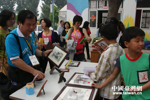 臺灣參訪團成員在欣賞孩子們的畫作。(中國臺灣網(wǎng) 郭瑩瑩 攝)