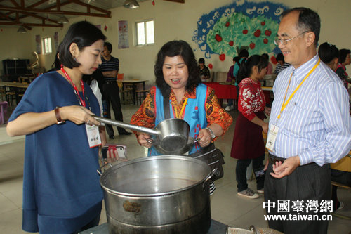 林彩媚團長(左)與參訪團成員一起享用孩子們親手做的午餐。(中國臺灣網(wǎng) 郭瑩瑩 攝)