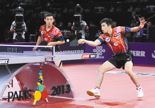 中華臺北乒乓球男雙搭檔陳建安(左)與莊智淵,在巴黎世乒賽擊敗大陸對手馬琳/郝帥奪冠。(圖片來自臺媒)