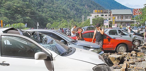 臺灣南投縣臺14線觀音瀑布路段,停靠路邊的數輛車,被地震時滾落的石塊砸毀。(圖片來自臺媒)