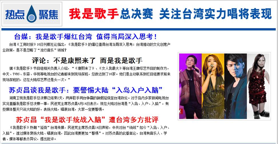 《我是歌手》總決賽,4名臺灣唱將引發(fā)島內(nèi)廣泛關(guān)注,多家電視臺也因此予以大篇幅報道。(圖片來源:中國臺灣網(wǎng))