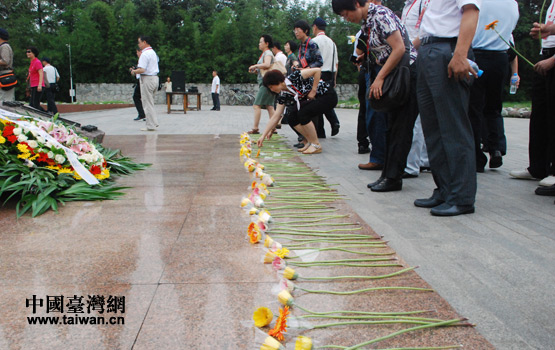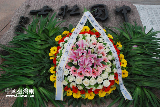 6月17日上午,在中國壯士群雕廣場,兩岸的黃埔親屬、黃埔代表一起,為抗戰英烈雕像敬獻了花環。(中國臺灣網 李丹 攝)
