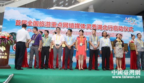 全國(guó)網(wǎng)民評(píng)選湖北最受歡迎的旅游品牌代表接受授牌。(中國(guó)臺(tái)灣網(wǎng) 李杰 攝)
