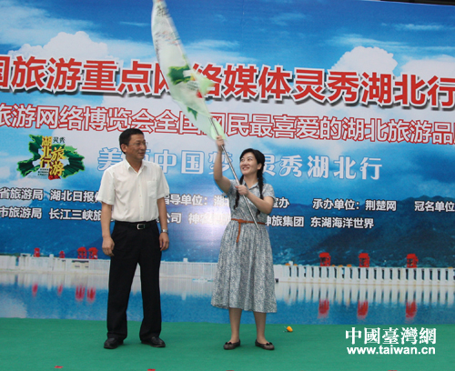 湖北省旅游局副巡視員劉晗為“靈秀湖北行”授旗。(中國(guó)臺(tái)灣網(wǎng) 李杰 攝)
