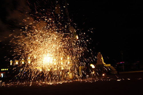 在篝火晚會現場,蒙古族勇士表演打樹花,將1600度的鐵水潑向天空,形成美麗的火花(中國臺灣網 蕪同 攝)