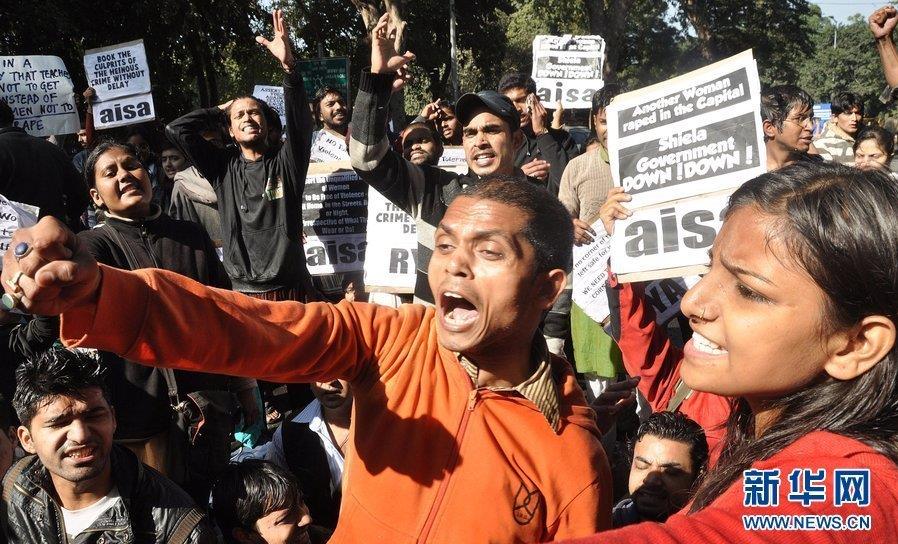 2012年12月19日,印度新德里,印度人民黨的女成員游行譴責女生在公交車上被輪奸的事件。2012年12月16日晚一名23歲的醫學女生在德里南部與其男性朋友一起乘公交時,車上包括司機在內的7名男子對兩人進行毆打,并輪奸了女生,之后將二人扔出公交車逃逸。圖片來源:新華網