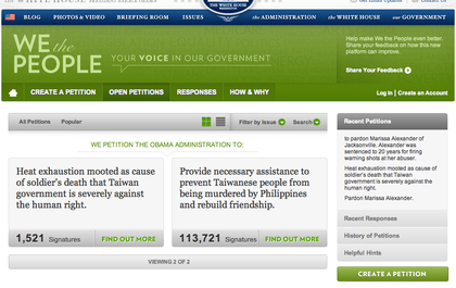 “We The People”網站是美國白宮設立,針對重要議題讓人民有權利要求政府采取行動和響應,只要獲得網絡上10萬人聯署,美國官方就必須正式響應,目前洪案僅有1521人聯署。(中國臺灣網 王文英)