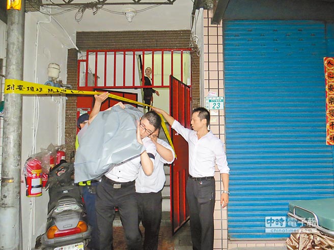 房客殺害房東雙尸案,殯葬業(yè)者將房客遺體運(yùn)出。(圖片來源:臺(tái)灣《中國(guó)時(shí)報(bào)》)