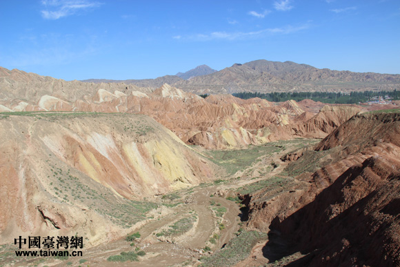 “海峽兩岸記者西北行”聯合采訪團參訪張掖丹霞國家地質公園,感受中國第一七彩丘陵神奇景觀。(中國臺灣網 王文英 攝)