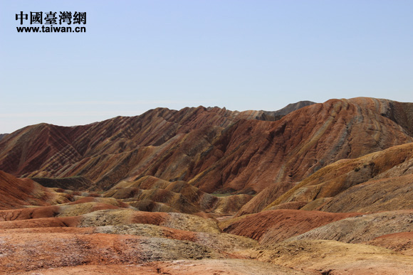 “海峽兩岸記者西北行”聯合采訪團參訪張掖丹霞國家地質公園,感受中國第一七彩丘陵神奇景觀。(中國臺灣網 王文英 攝)
