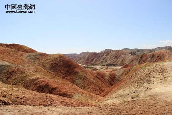 “海峽兩岸記者西北行”聯合采訪團參訪張掖丹霞國家地質公園,感受中國第一七彩丘陵神奇景觀。(中國臺灣網 王文英 攝)
