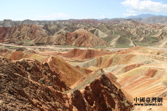 “海峽兩岸記者西北行”聯合采訪團參訪張掖丹霞國家地質公園,感受中國第一七彩丘陵神奇景觀。(中國臺灣網 王文英 攝)