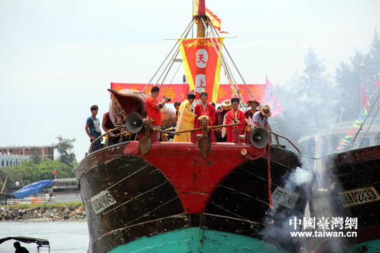鞭炮響起,祭海儀式開始,海南瓊海潭門漁港數(shù)百艘漁船駛出港口赴南海捕魚。(中國臺灣網(wǎng) 李丹 攝)