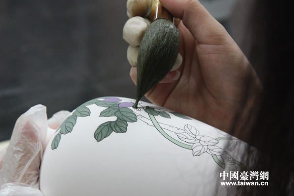 工藝師在制作間為湘瓷彩繪(中國臺灣網 李徽 攝)