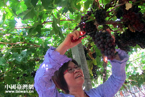參訪團成員在兵農(nóng)葡萄莊園體驗采摘。(中國臺灣網(wǎng) 王偉 攝)