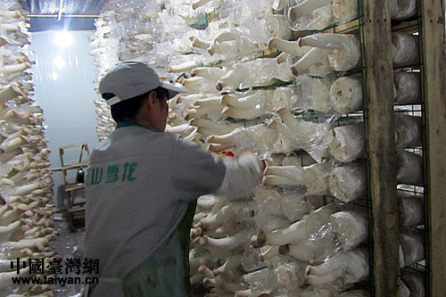 工人在采摘食用菌。(中國臺灣網(wǎng) 王偉 攝)