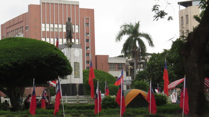 湯德章紀念公園內的孫文銅像,26日下午守護民眾將撤場。(圖片取自臺媒)